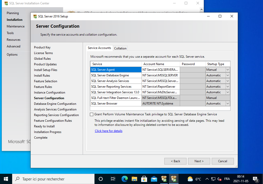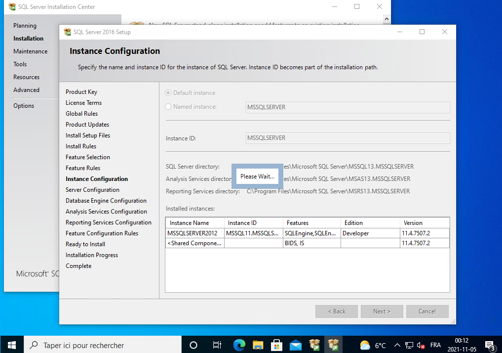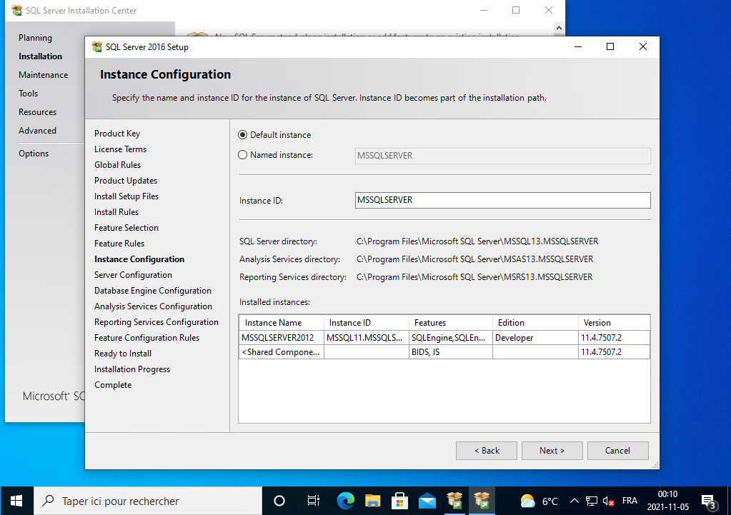 Vous sélectionnez le bouton radio «Default instance» et vous cliquez sur le bouton Next :