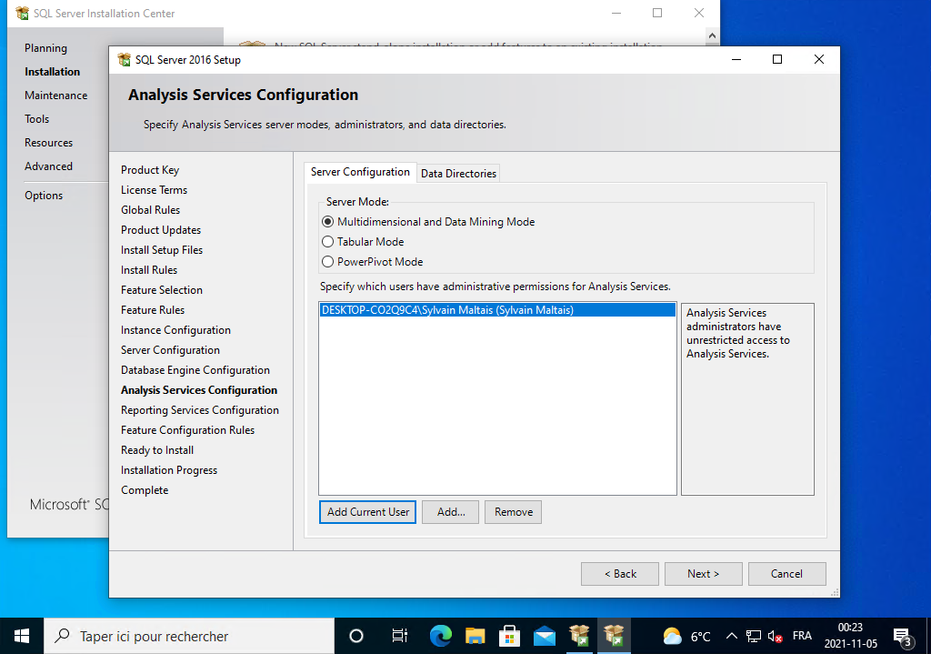 Vous sélectionnez le bouton radio «Multidimensional and Data Mining Mode», vous cliquez sur le bouton Add Current User et vous cliquez sur le bouton Next :