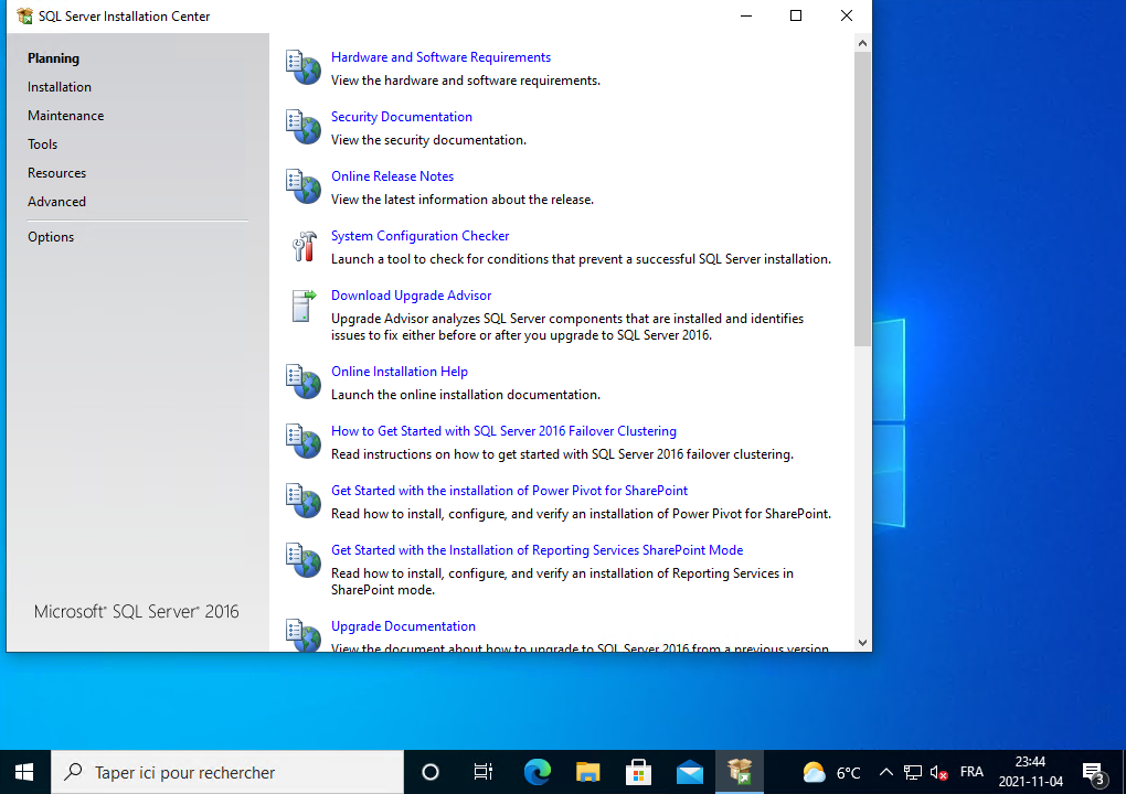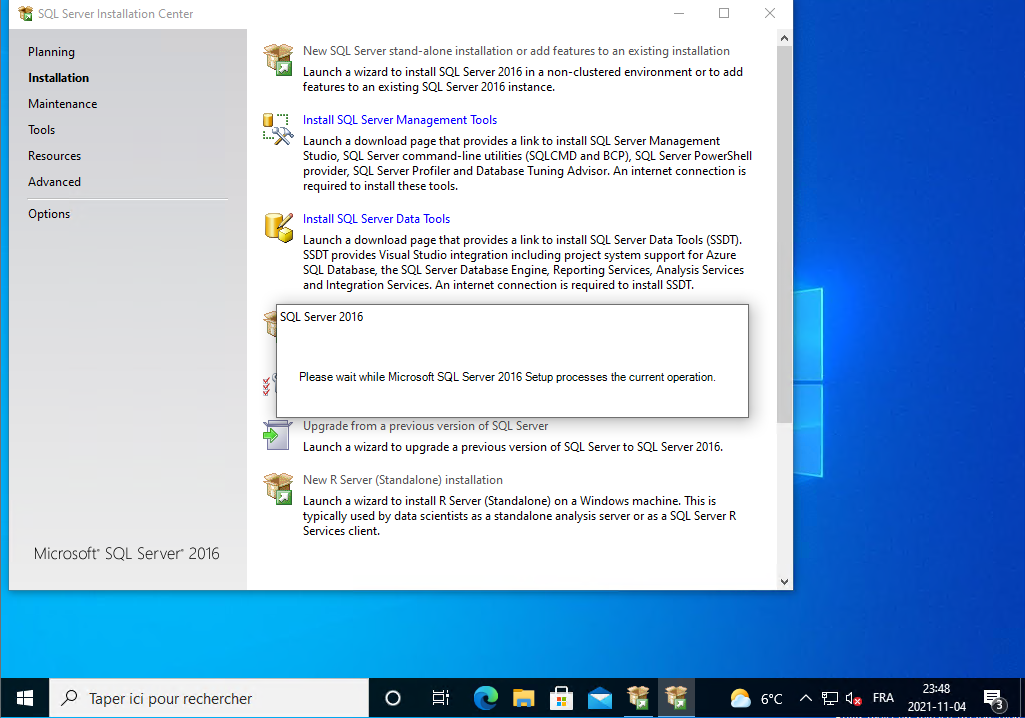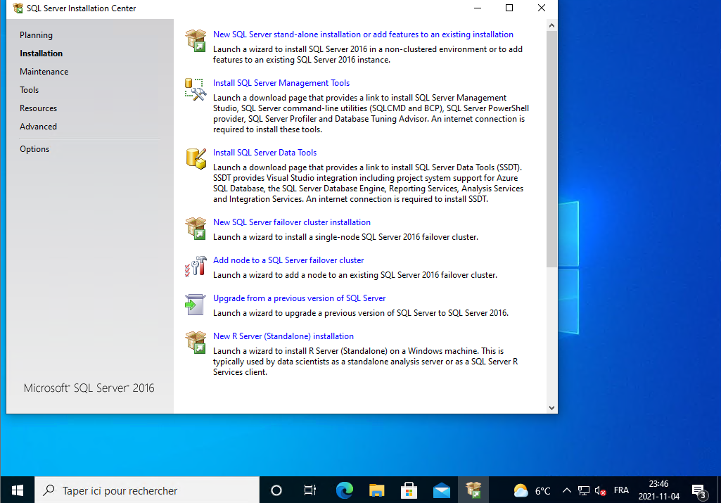Vous cliquez sur le premier option de la colonne de droite, soit «New SQL Server stand-alone installation or add features to an existing installation» :