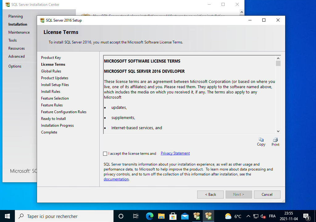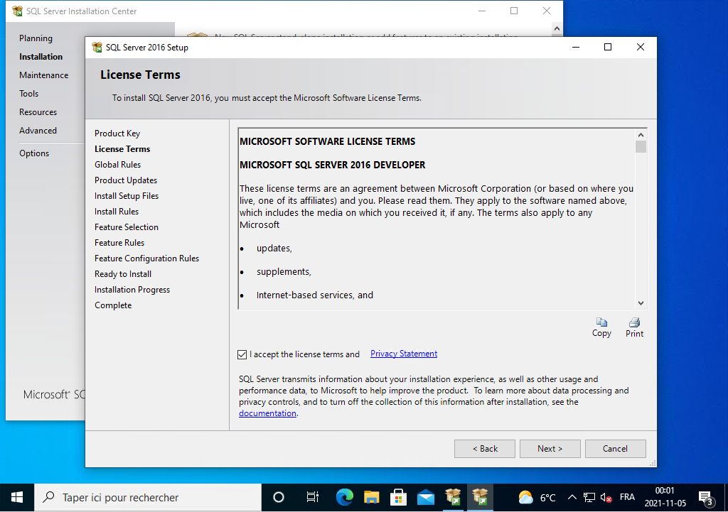 Il affiche le contrat de licence. Vous cliquez sur la case à cocher «I accept the licence terms and Pricacy Statement» :