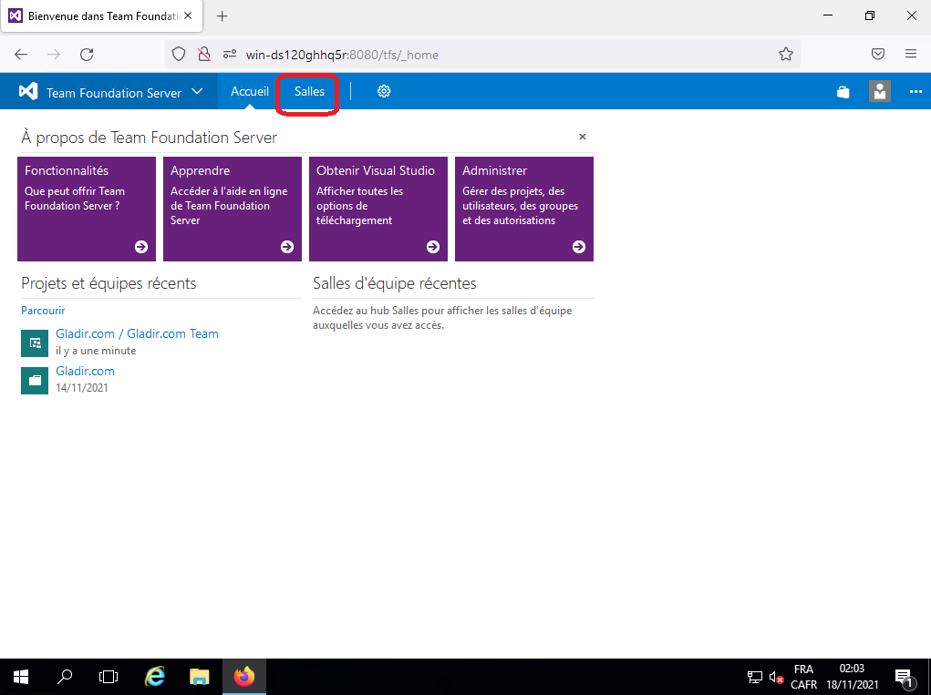 - Accédez à la page d'accueil de Team Web Access en parcourant http://monserveurtfs:8080/tfs/_home.