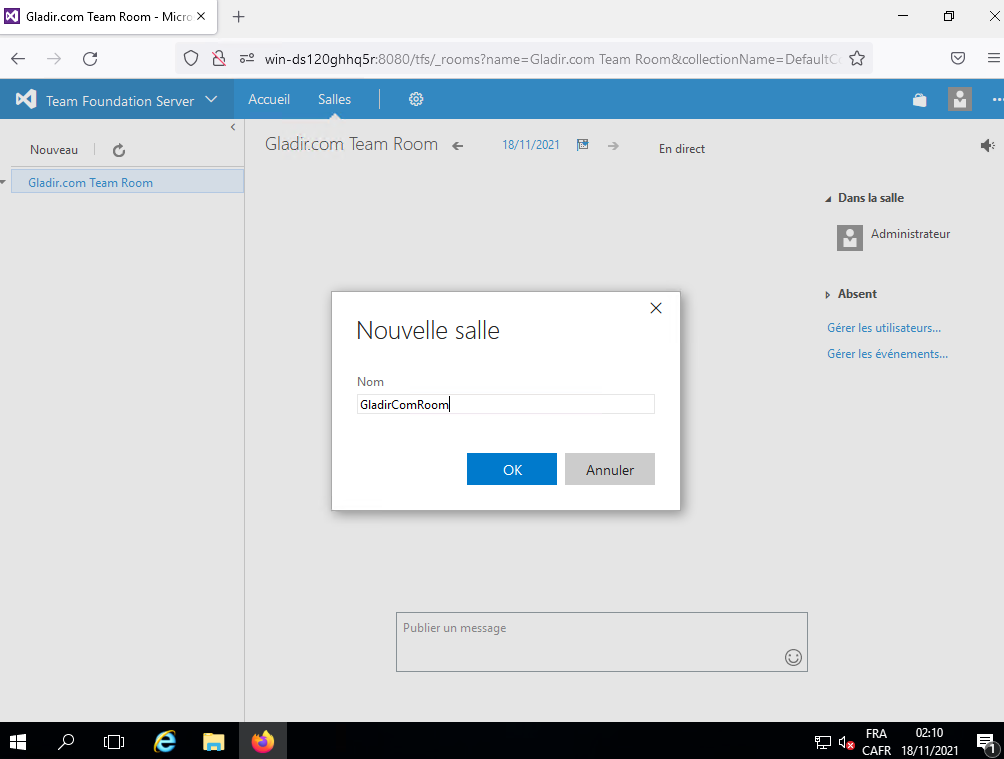- Cliquez sur le bouton New ou Nouveau pour créer une nouvelle salle d'équipe. Entrez le nom comme GladirComRoom. Cliquez sur OK pour accéder au GladirComRoom :