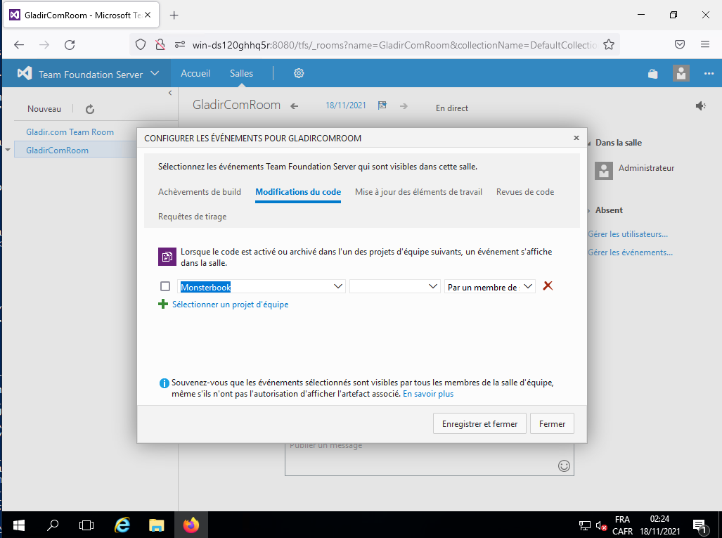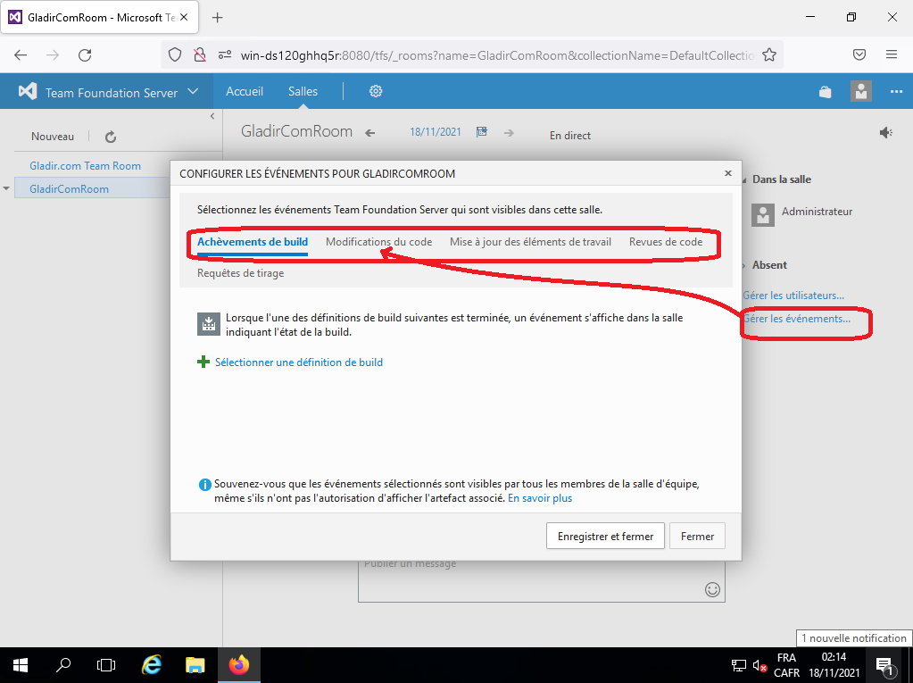 - Cliquez sur le lien «Manage events...» ou «Gérer les événements...» pour choisir les événements TFS visibles dans le GladirComRoom :