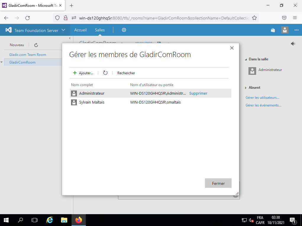 - Cliquez sur le lien «Manage users...» ou «Gérer les utilisateurs...» et choisissez Ajouter un groupe TFS pour sélectionner Monsterbook. Cela ajoutera tous les membres de l'équipe MonsterBook au GladirComTeam. Pour valider vos modifications, cliquez sur Fermer :