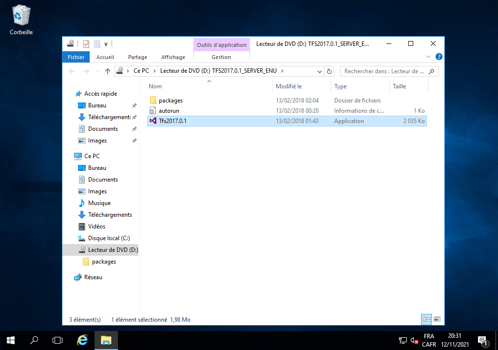Voici les différentes étapes de l'installation de Team Foundation Server 2017 sous Windows Server 2016. Tout d'abord lancer le fichier tfs2017.0.1 situé dans le dossier racine :
