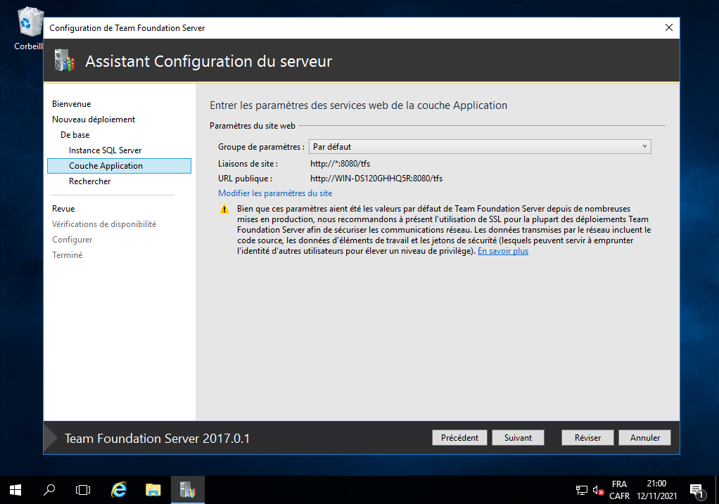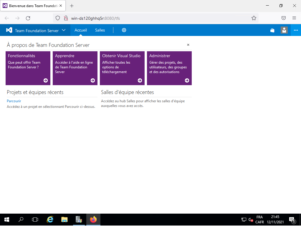 L'installation a réussis, cliquez sur le lien à droite du «Team Foundation Server:» pour vérifier que le site fonctionne :