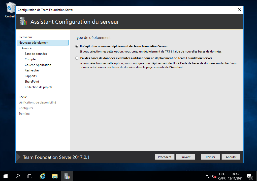 Vous sélectionnez le bouton radio «Il s'agit d'un nouveau déploiement de Team Foundation Server» et vous cliquez sur le bouton Suivant :