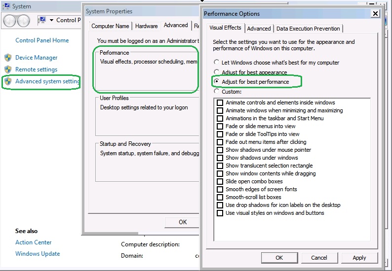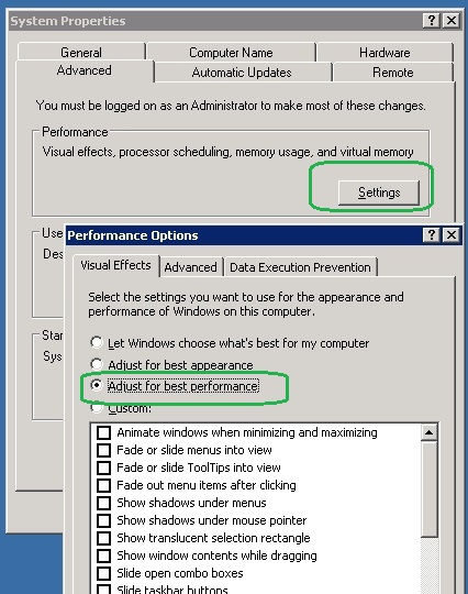 Autant Windows que Linux, les effets spéciaux que procurent les environnements graphiques de ses systèmes d'exploitation nuisent considérablement à l'efficacité de vos VMs. Dans le cas de Windows, vous devrez aller dans «Performance Options», l'onglet «Visual Effects» et sélectionner le bouton radio pour «Adjust for best performances».
