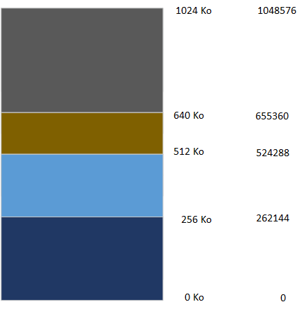Le numéro sur cette carte mémoire apparaît deux fois. La colonne de gauche représente la mémoire totale arrondie en kilo-octets. Les nombres à droite sont les adresses des octets individuels. La ligne représentant 640 Ko est significative pour les utilisateurs de PC, comme nous le verrons plus loin.