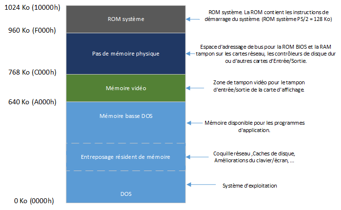 Les concepteurs de l'IBM PC ont divisé la mémoire en deux parties : une partie de 640 Ko et une partie de 384 Ko. Étant donné que la division de 640 Ko commence à l'adresse zéro, nous l'appelons mémoire DOS basse. Les 384 Ko supérieurs correspondent à la zone de mémoire DOS haute.