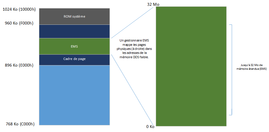 Le problème est que DOS et le microprocesseur 8088 reconnaissent la présence de mémoire paginée. Une carte mémoire EMS contient du matériel dédié à cette tâche. Le matériel EMS fait apparaître la mémoire en dehors du premier mégaoctet dans ce mégaoctet.