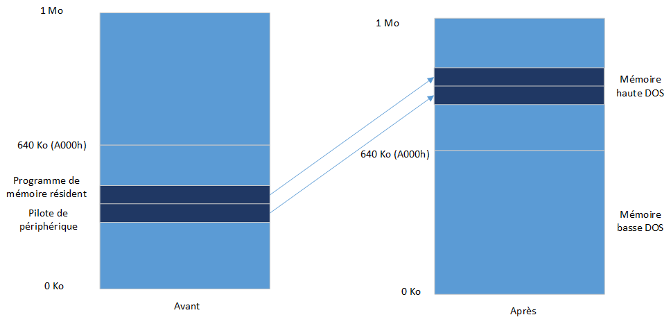 La majeure partie de la mémoire DOS basse est disponible pour les programmes d'application tels que les tableurs et les traitements de texte. Le DOS lui-même utilise une partie de ces 640 Ko. Les programmes d'arrière-plan prennent également de la place. Ces programmes utiles sont connus sous le nom de logiciels résidents en mémoire ou de programmes résidents de fin et de séjour. Les pilotes de périphérique résident également dans une mémoire insuffisante. Un pilote de périphérique est un programme contrôlant un élément matériel spécifique; une souris, par exemple.