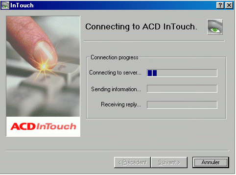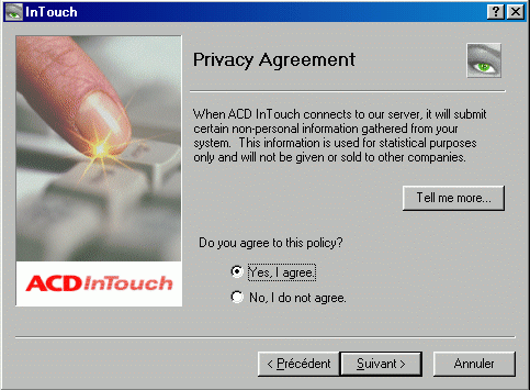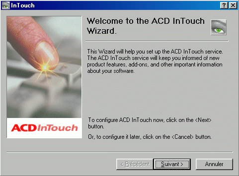 L'installation du logiciel et de l'enregistrement se fait en deux étapes. Tout d'abord, il faut lancer l'exécutable. Ensuite on suit les étapes appropriés. La présentation dans cette page a été faite sur Windows 98. Voici l'écran de présentation lorsqu'on entre dans l'installation: