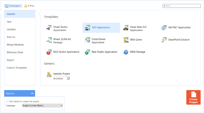 - Installer - Nouveau projet d'installateur générique ou spécialisé.