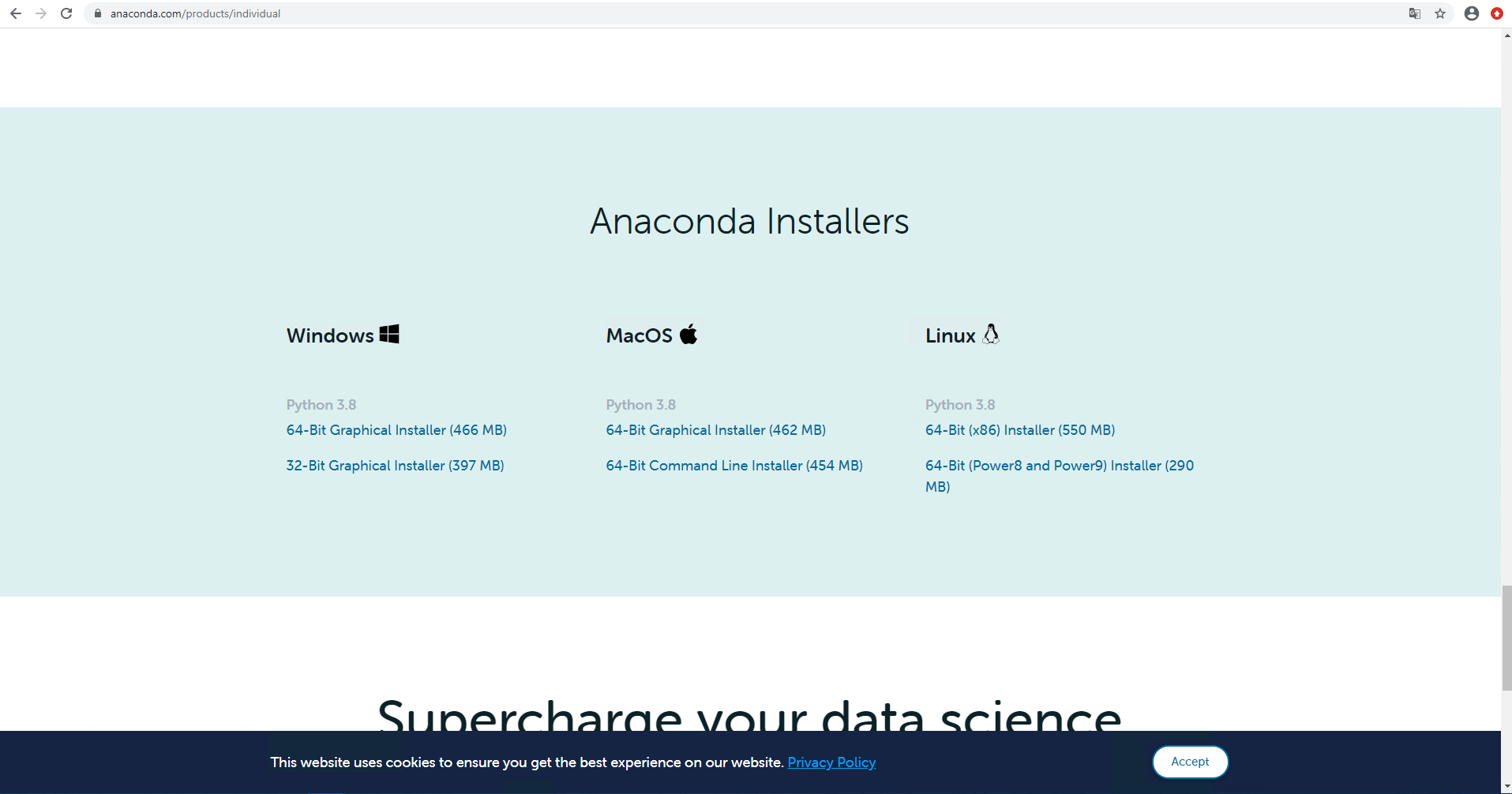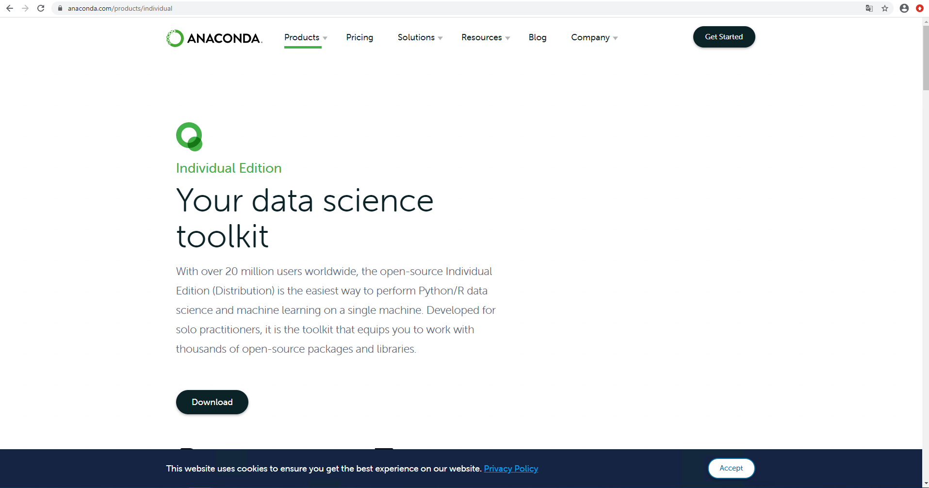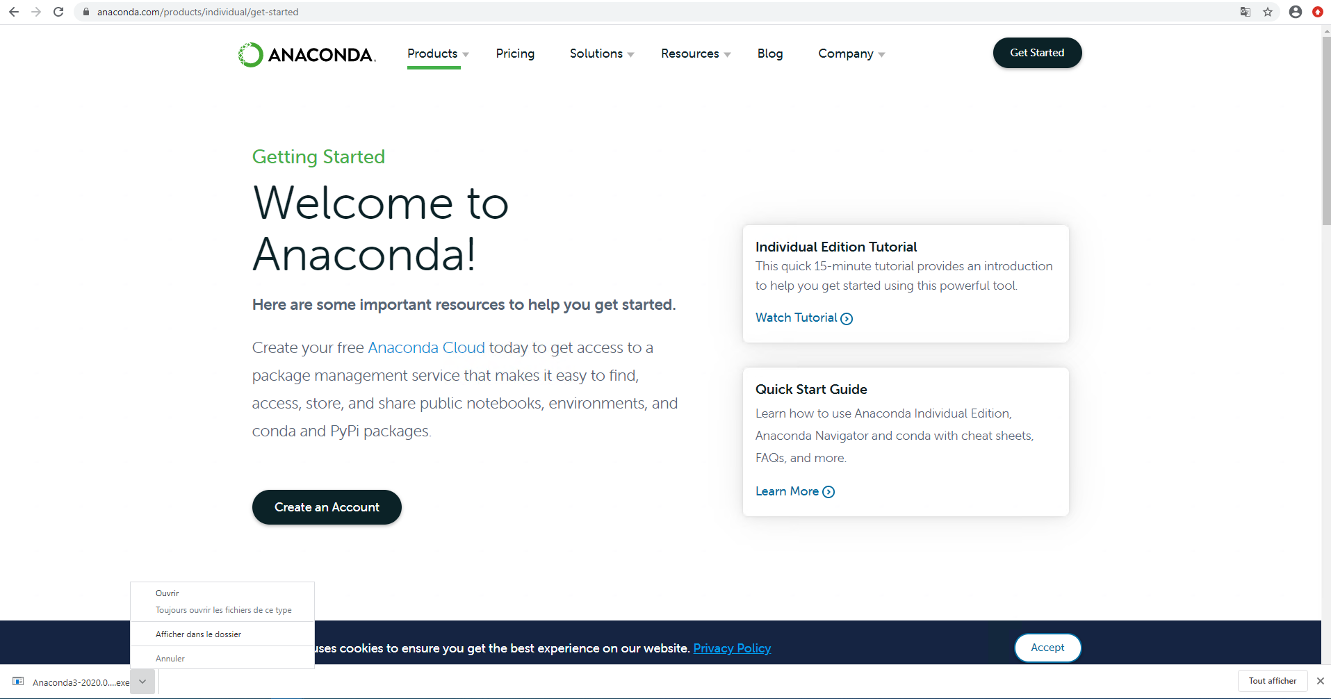 L'installation du logiciel du Anaconda sous Windows 10 se fait de la manière suivante. Vous devez d'abord aller sur la page https://anaconda.com/products/individual et vous cliquez sur le bouton Download :