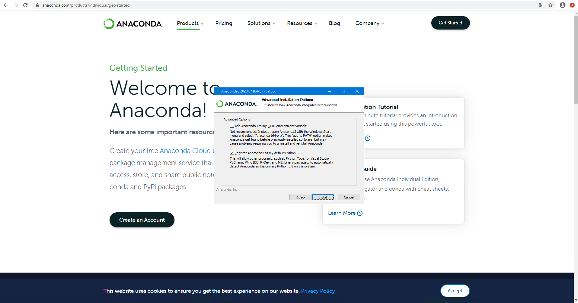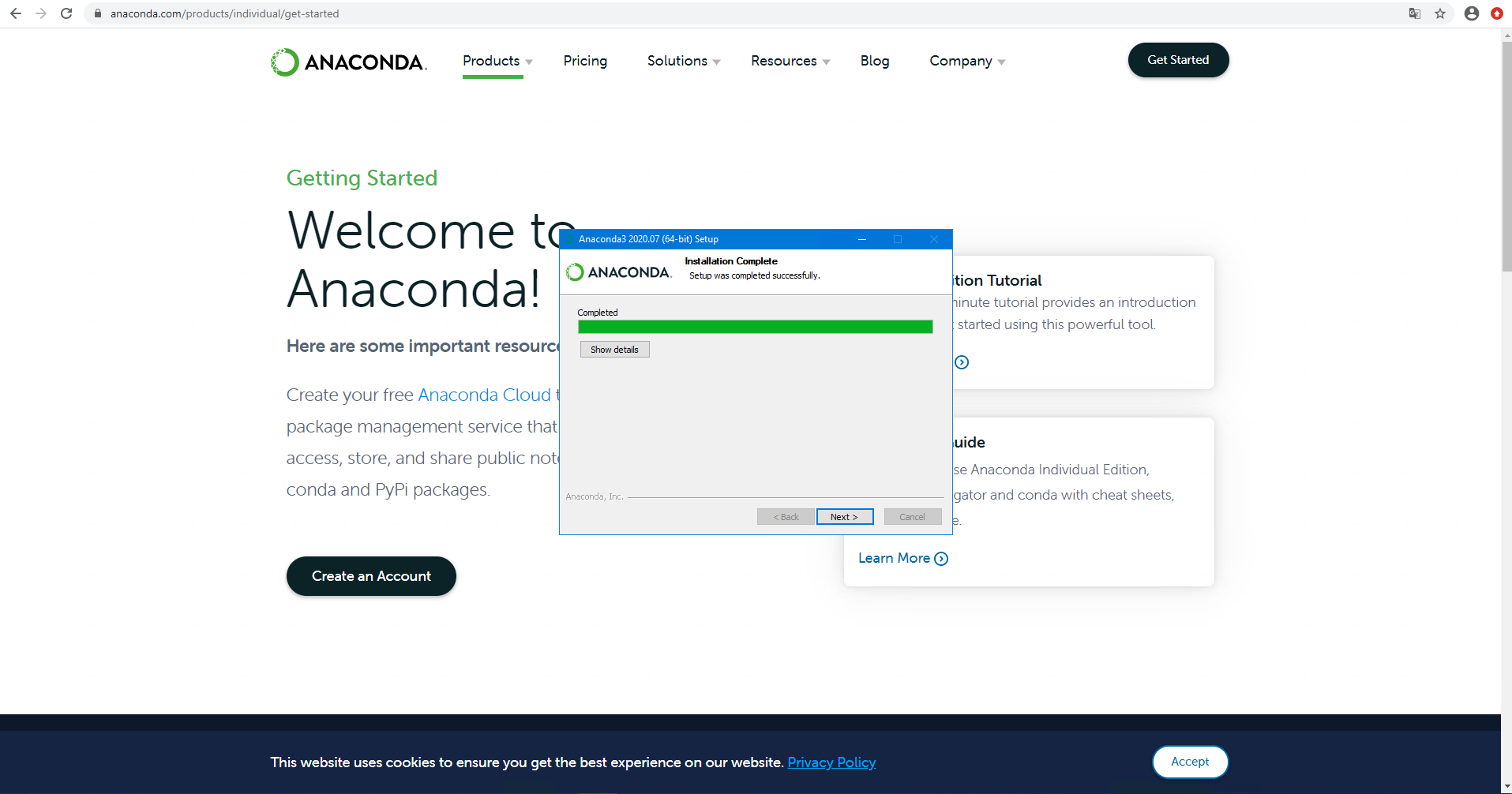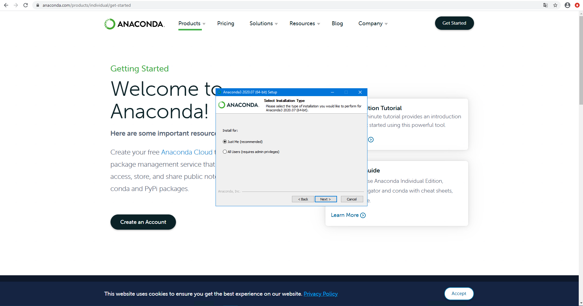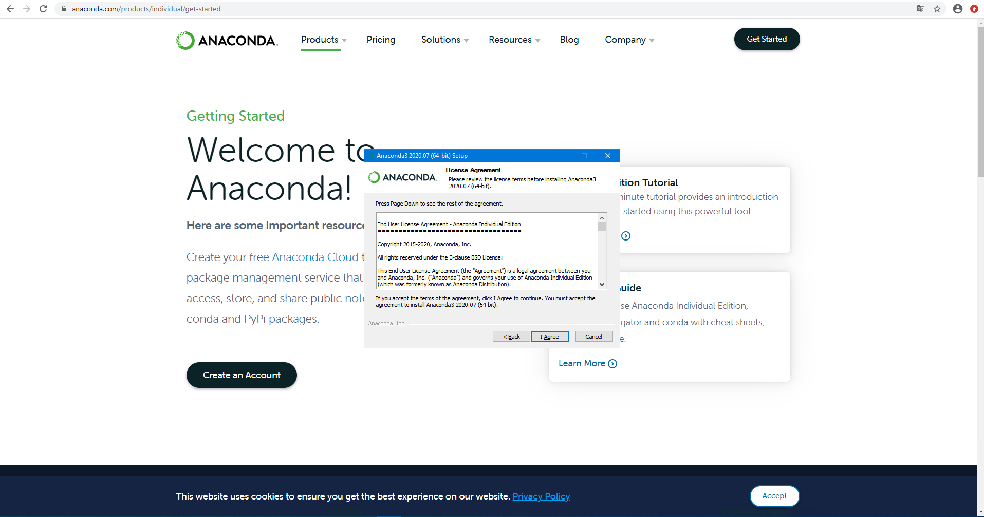 L'installation du logiciel du Anaconda sous Windows 10 se fait de la manière suivante. Vous devez d'abord aller sur la page https://anaconda.com/products/individual et vous cliquez sur le bouton Download :