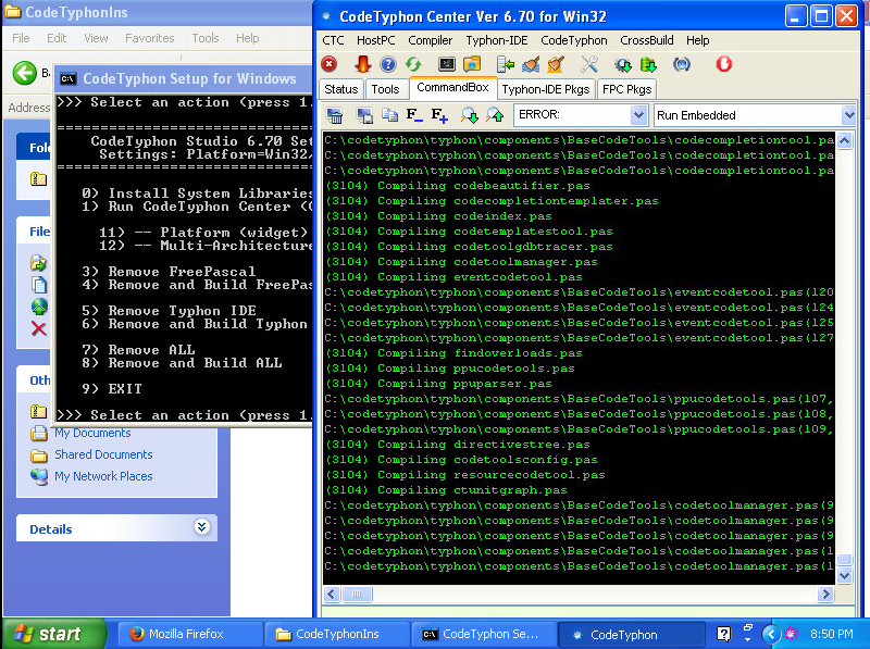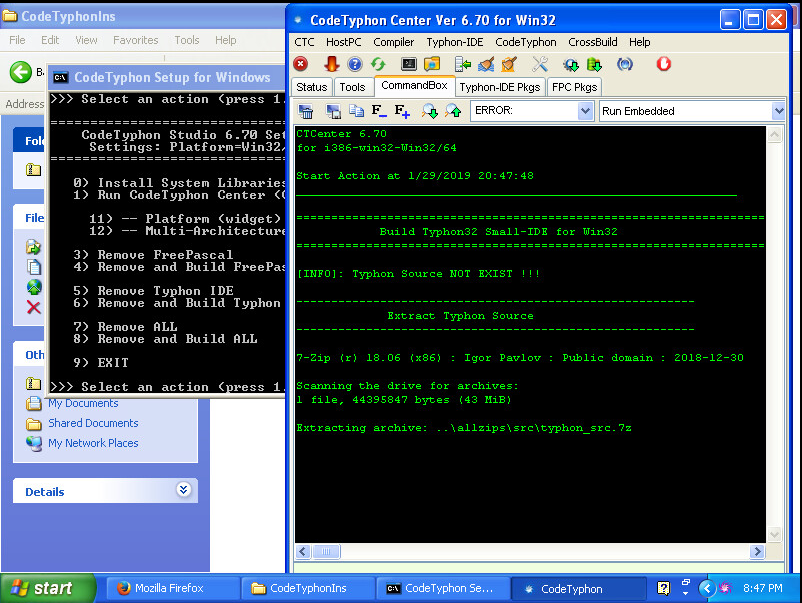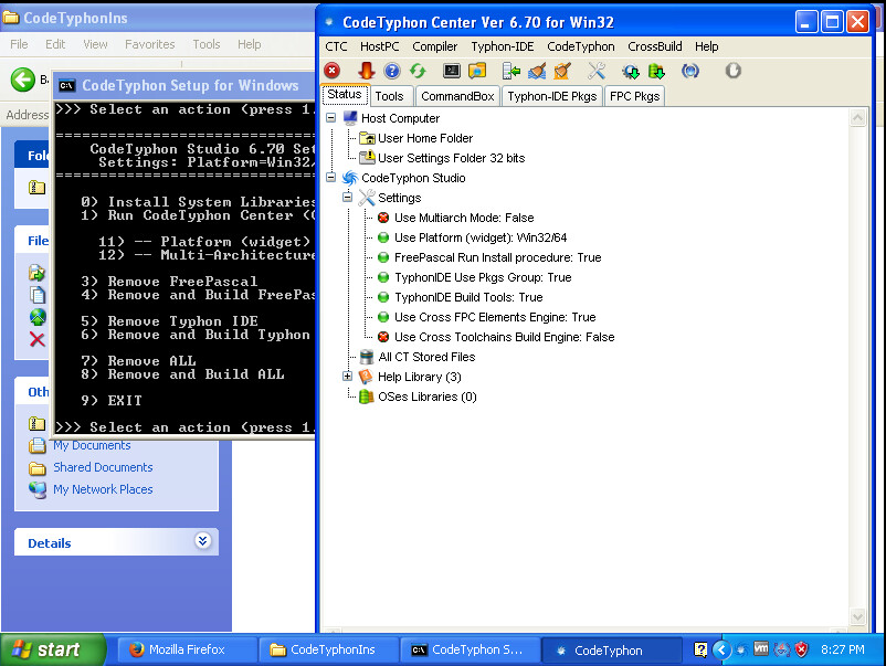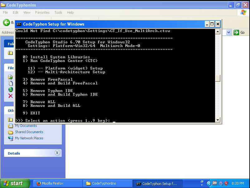 Il affiche maintenant les options relié au CodeTyphon Studio. Vous devez d'abord installer les bibliothèques systèmes. Vous cliquez sur la touche 0 et ensuite sur la touche Enter :