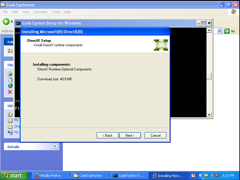 Il vous indique qu'il doit télécharger 50 Mo de fichiers pour pouvoir installer DirectX. Vous cliquez sur le bouton «Next» :