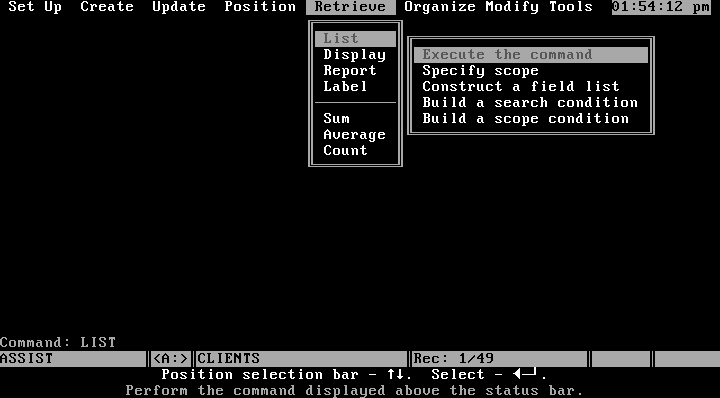 Dans les sous-menus de ce type, s'il y a plus d'options que la fenêtre ne peut en contenir à la fois, utilisez ↑ et ↓ pour faire défiler les options supplémentaires dans la vue. Dans certains sous-menus, vous pouvez sélectionner plusieurs éléments en appuyant sur ENTER après chaque sélection. Lorsque vous sélectionnez chaque élément, dBASE III PLUS 1.1 le marque avec ">". Appuyez ensuite sur ← ou → pour continuer.