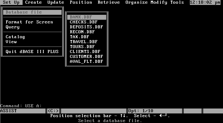 Vous pouvez utiliser l'assistant pour créer des fichiers de base de données. Lorsque vous démarrez dBASE III PLUS 1.1, les sélections du menu de l'Assistant apparaissent en haut de votre écran.