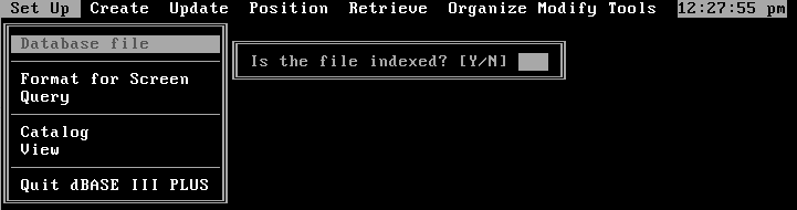 - Sélectionnez CLIENTS.DBF. Mettez l'option en surbrillance et appuyez sur ENTER. Désormais, ces instructions vous indiqueront simplement de sélectionner une option. («.DBF» signifie «Database File».) Le dBASE III PLUS 1.1 demande : «Is the file indexed? [Y/N]» :