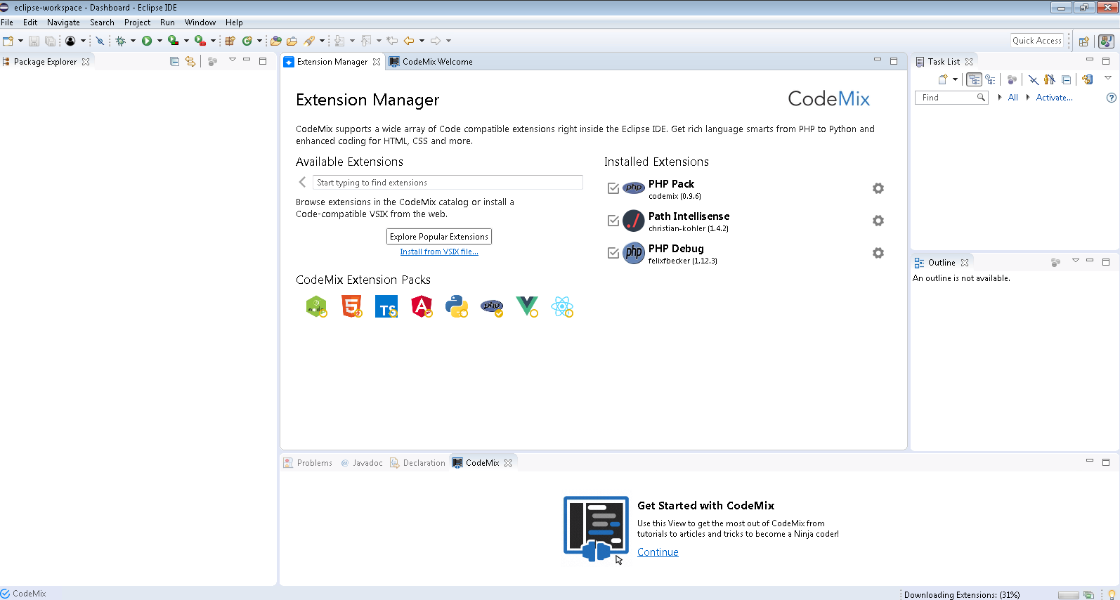 Il affiche alors une page de présentation du CodeMix 3. Vous cliquez sur l'onglet «Extension Manager» situé à côté de «CodeMix Welcome» :