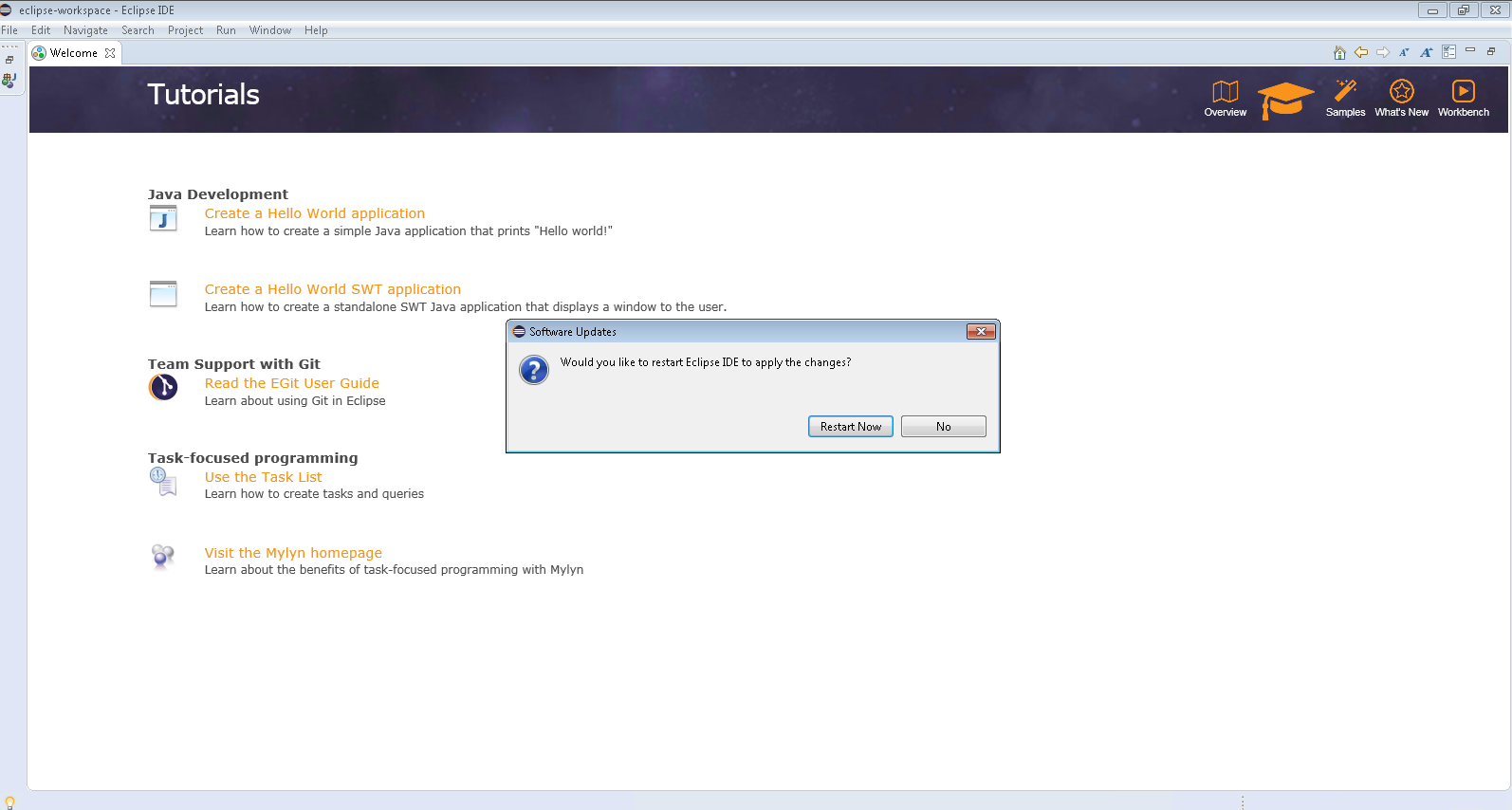 Au bout d'un certain moment, il affiche une fenêtre vous indiquant qu'il faut redémarrer l'IDE d'Eclipse pour que les changements soient effectifs. Vous cliquez sur le bouton «Restart Now» :