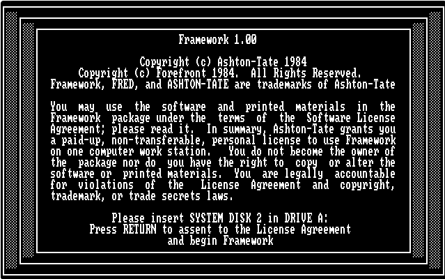 Le logiciel Framework est le meilleur logiciel de productivité disponible pour les personnes ayant besoin de traitement de texte, de feuilles de calcul, de gestion de base de données, de plans, de graphiques professionnels et de communications. La fonction de contour de Framework offre une gestion puissante et unifiée du texte, des feuilles de calcul, des graphiques, des bases de données et des idées. Les commandes sont cohérentes dans toutes les applications. Une aide contextuelle est disponible en ligne et une puissante commande "annuler" permet une correction efficace des erreurs. Intégrez du texte et des graphiques. Framework a de puissantes capacités de macro, avec enregistrement de frappe. Framework fournit un couplage étroit avec dBase II et dBase III, ainsi que la possibilité d'utiliser des fichiers de Lotus 1-2-3, WordStar et d'autres formats standard.