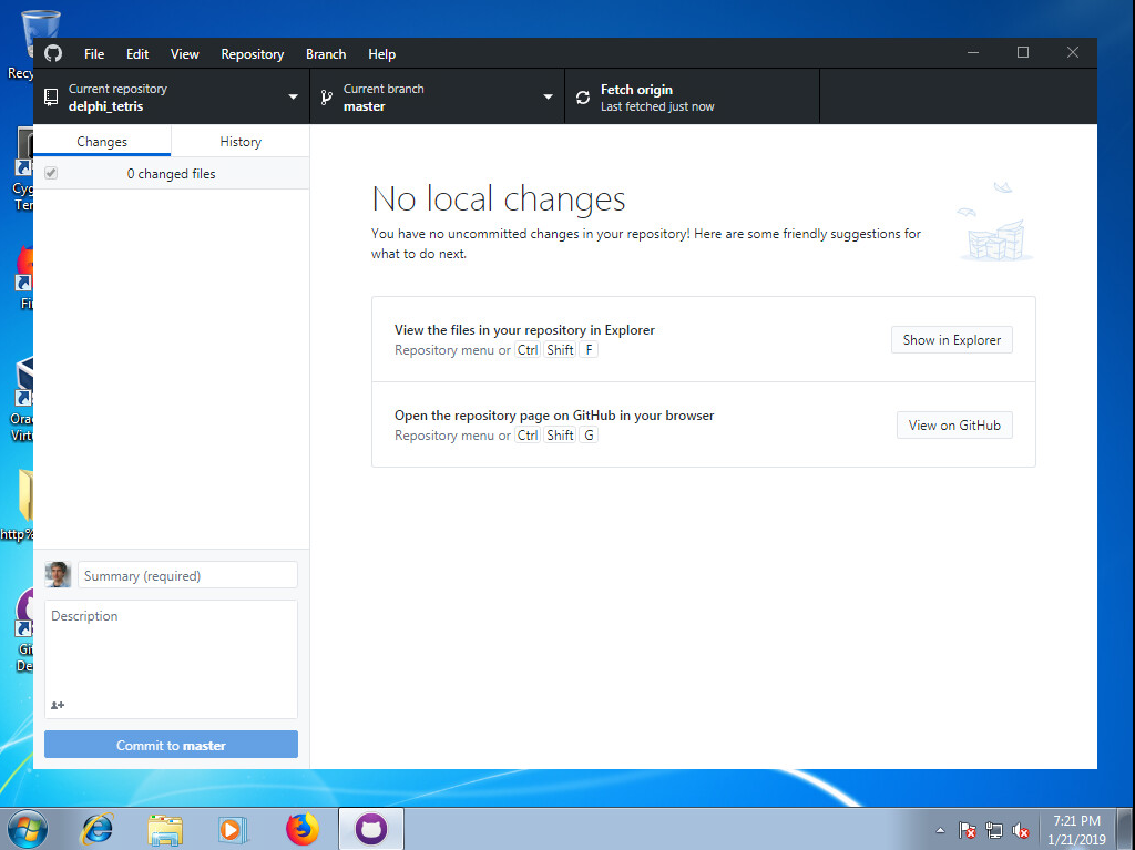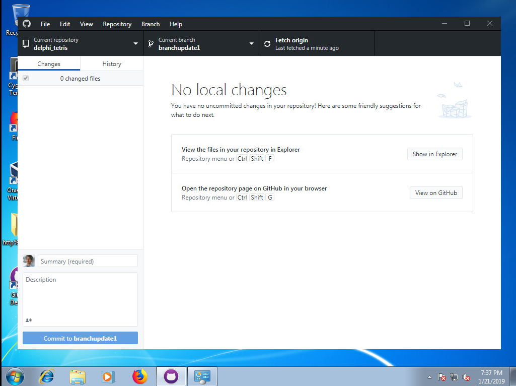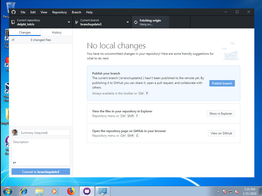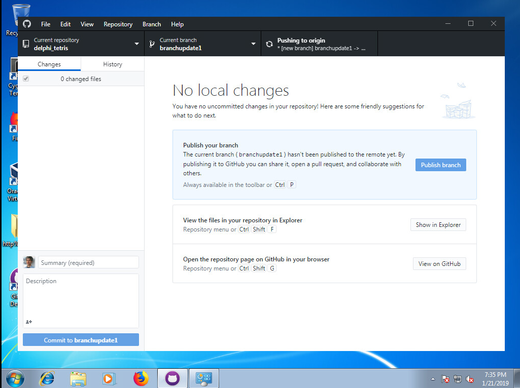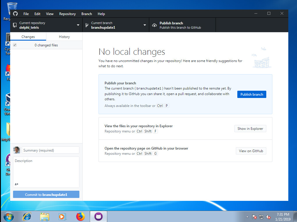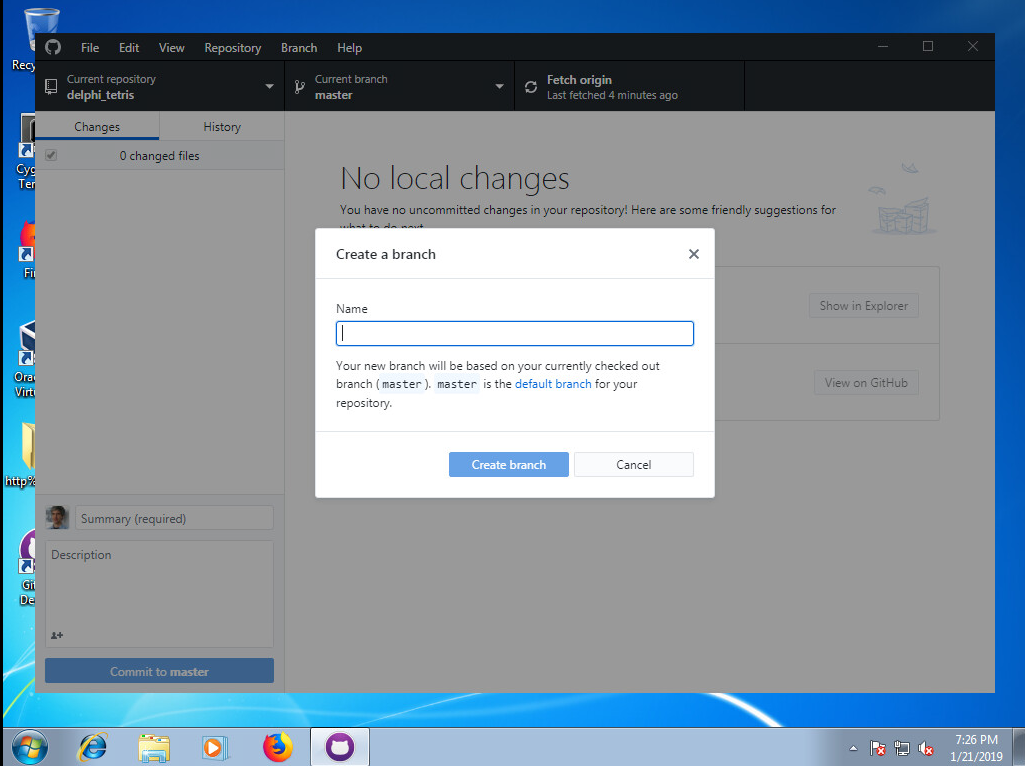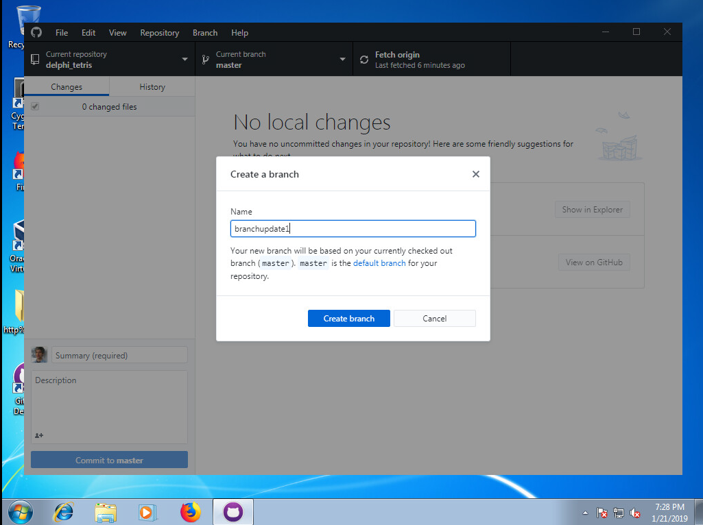 Voici comment créer une branche à partir de la branche master d'un projet dans GitHub Desktop. Choisis départ votre dépôt (repository). Dans l'exemple suivant, il s'agit de «delphi_tetris» :