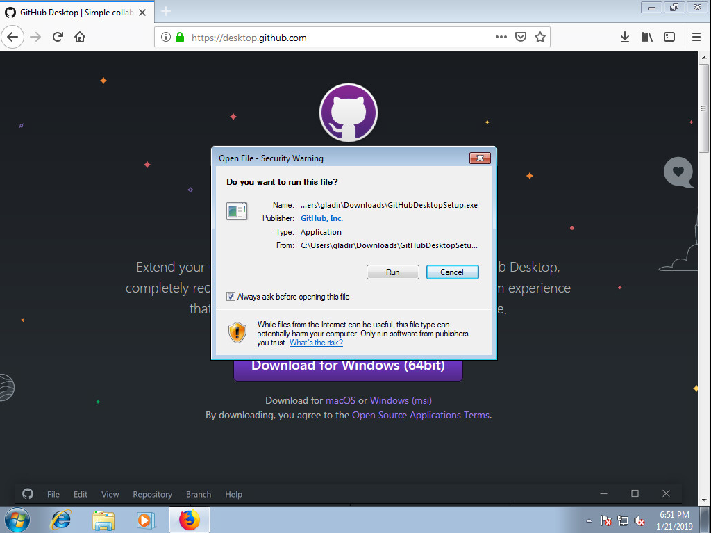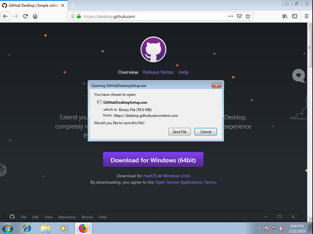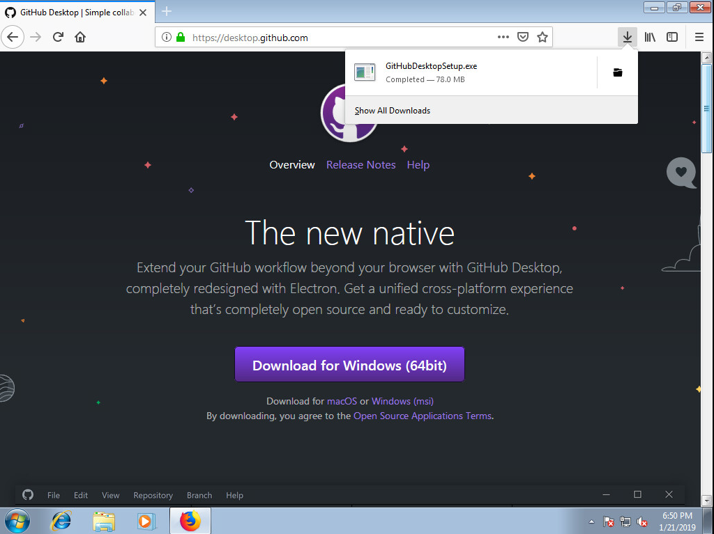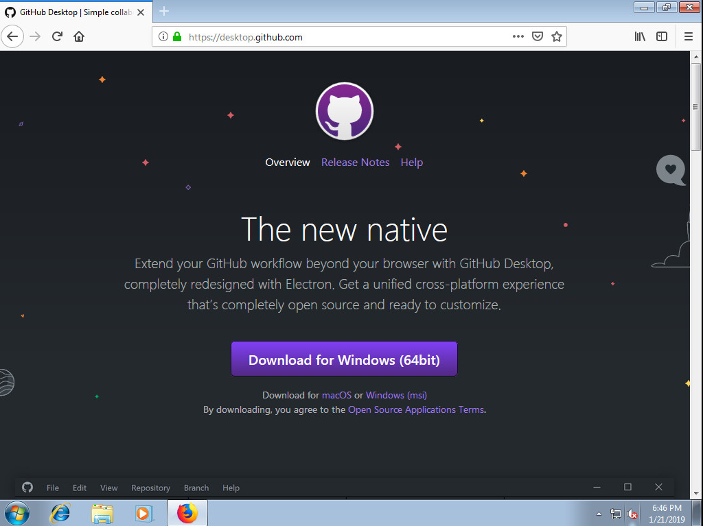 Pour installer GitHub Desktop sous Microsoft Windows 7 64 bits, vous devez d'abord aller sur le site Web https://desktop.github.com/ et cliquez sur le bouton «Download for Windows (64bit)» :
