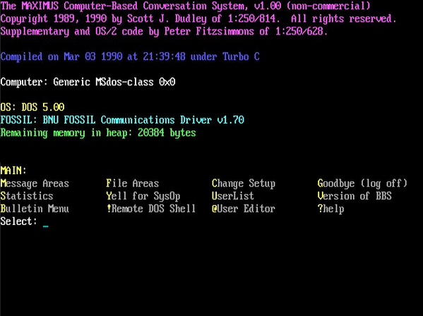 Le logiciel Maximus est un BBS développé à l'origine par Scott J. Dudley via sa société, Lanius Corporation. Le logiciel a d'abord été écrit et publié pour MS-DOS et OS/2, les versions ultérieures prenant en charge les systèmes d'exploitation Windows 32 bits. La version MS-DOS interfacée avec le port série (et donc le modem) via un pilote FOSSIL. La version 1.0 a été publiée en 1990, suivie des versions 2.0 et 3.01 en 1991 et 1995. Le code source de Maximus et de ses utilitaires associés, tels que Squish, a été publié sous la licence publique générale GNU en 2002. Il a depuis été porté pour exécuter sous Linux et d'autres systèmes d'exploitation de type Unix.