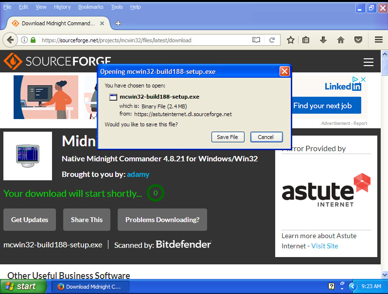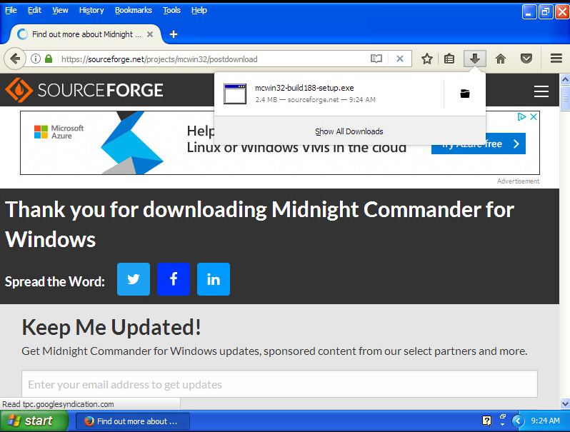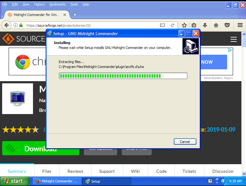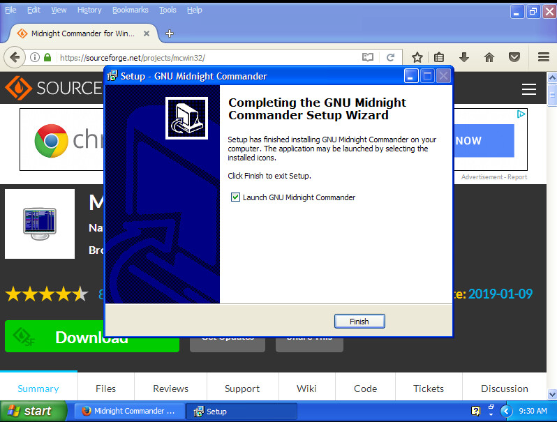 Voici les différentes étapes de l'installation du Midnight Commander sous Windows XP. Vous allez sur le site Web de SourceForge situé au lien URL «https://sourceforge.net/projects/mcwin32/». Vous cliquez sur le bouton «Download» :