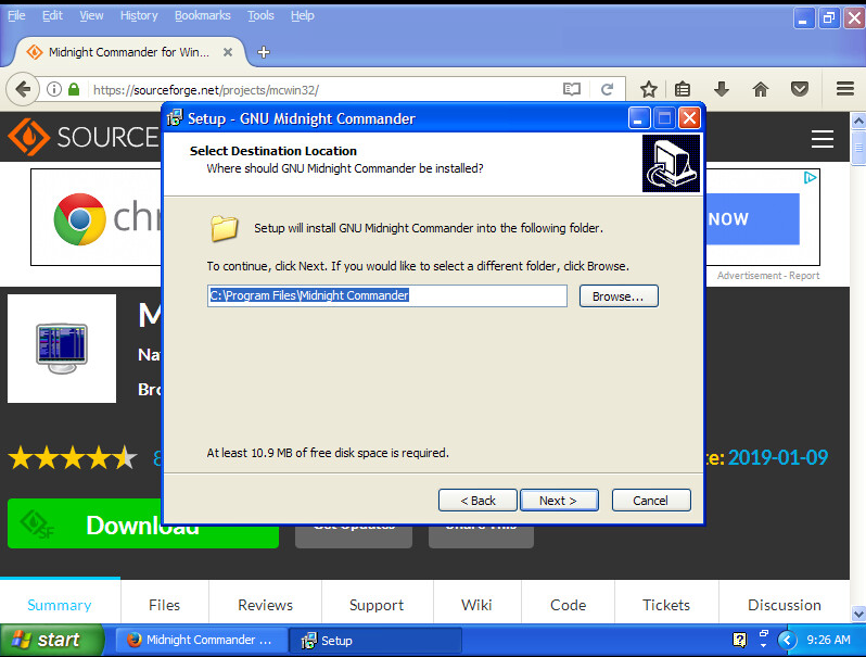 Il indique où il installera le logiciel Midnight Commander. Vous cliquez sur le bouton «Next >» :