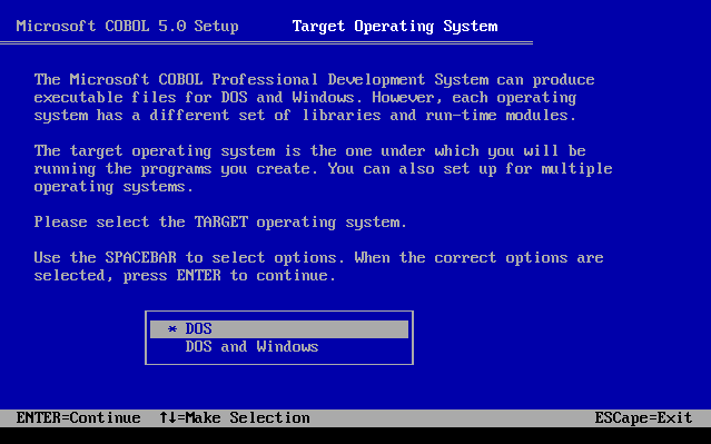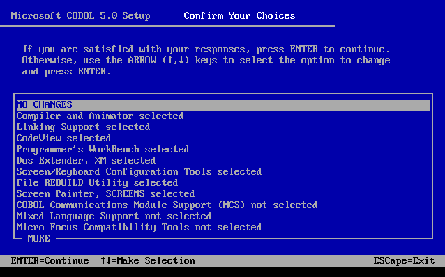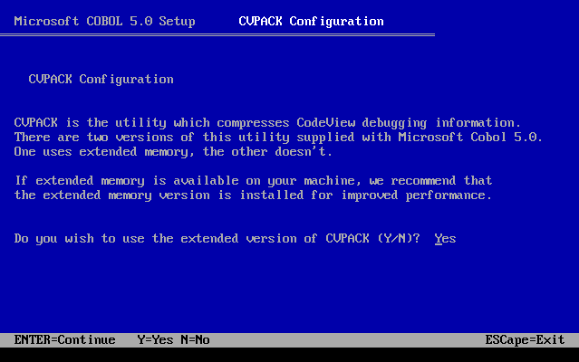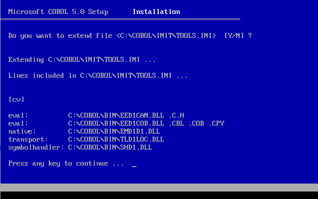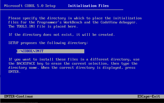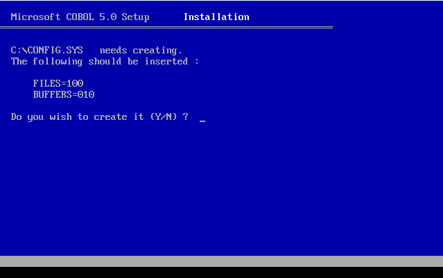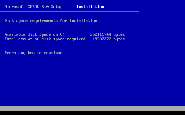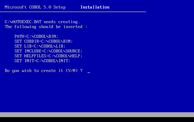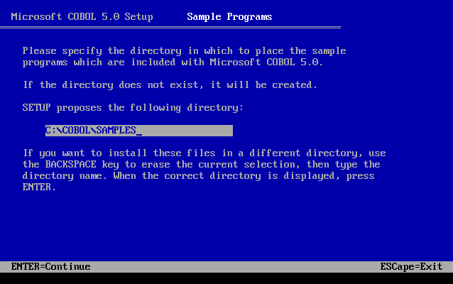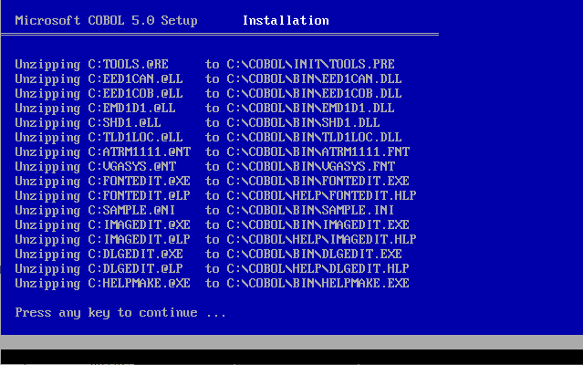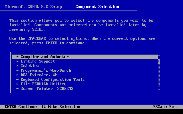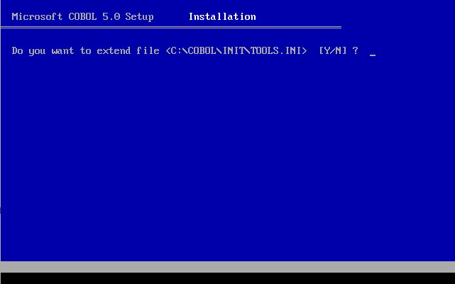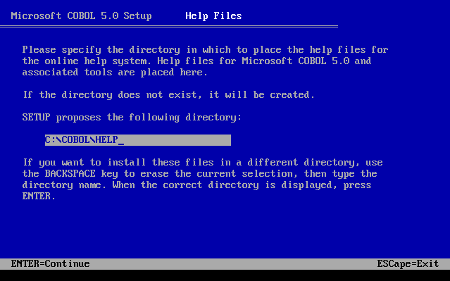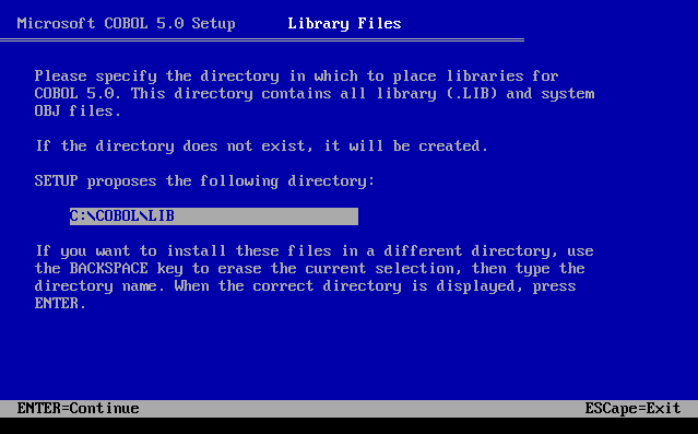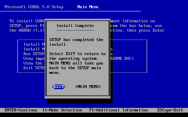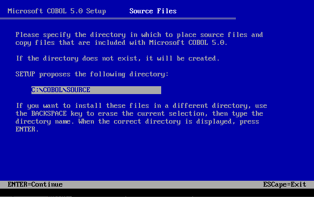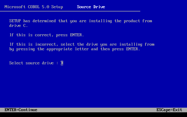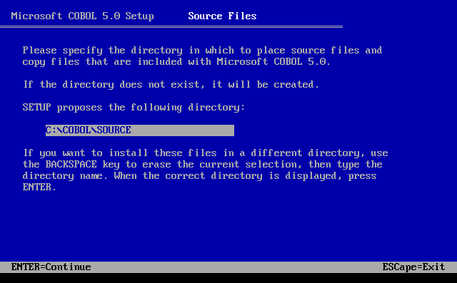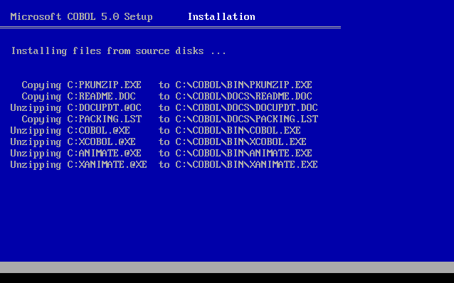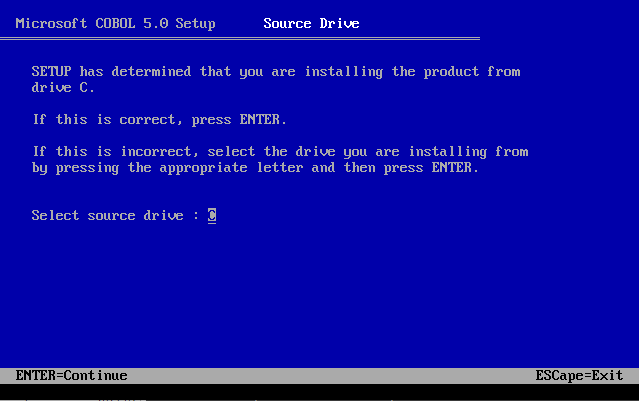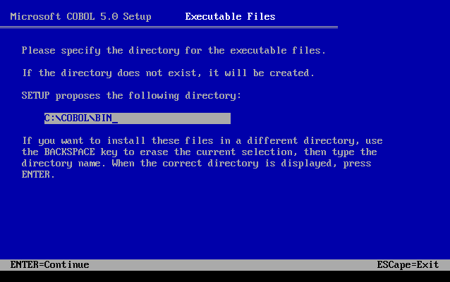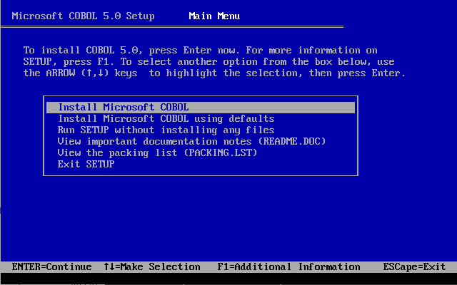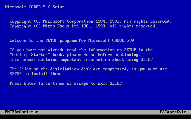Voici les différentes étapes d'installation du Microsoft COBOL 5.0. Exécuter le programme SETUP.EXE :