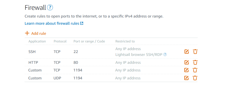 S'il ne retourne rien, c'est que votre port openvpn est bloqué ! Il vous faut alors le débloquer car sinon, personne ne sera capable d'accéder à votre VPN. Par exemple, sous AWS Lightsail, vous devriez voir devriez cliquez sur le bouton + Add rule :