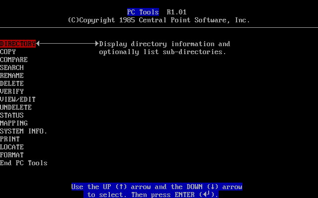 Le logiciel PC Tools 1 est la première version de la série du PC Tools de Central Point. Il se distingue par le fait qu'il est construit autour d'un menu centralisé offrant les possibilités communes du DOS et quelques suppléments informatifs. L'ergonomie est complètement différentes des versions suivantes.
