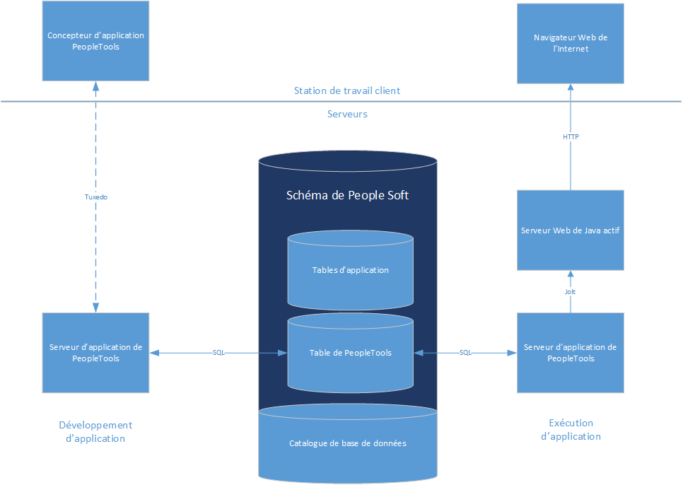 La base de données est la coeur de PeopleSoft. Les tables d'application contiennent les données des utilisateurs. Les communications entre les applications PeopleSoft s'effectuent par le PeopleTools. La combinaison technologique utilisant uniquement le navigateur Web avec des pages HTML est appelé PIA (Pure Internet Architecture) par PeopleSoft. Le logiciel peut utiliser plusieurs types de base de données comme par exemple Oracle Database SQL de Oracle Corporation, DB2 d'IBM, SQL Server de Microsoft, Sybase et Informix.
