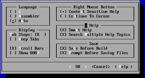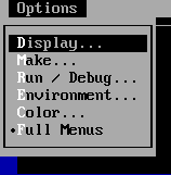 Les éléments du menu Options contrôlent l'environnement intégré. Par exemple, la commande Color... du menu Options vous permet de modifier les couleurs utilisées à l'écran. La commande Make... du menu Options contrôle les drapeaux affectant les actions du compilateur et de l'éditeur de liens.