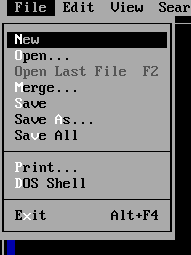 Le menu File contrôle les fichiers, vous permettant d'effacer la fenêtre source (New), de charger un fichier source existant (Open), d'ajouter un fichier au code source en mémoire (Merge), d'enregistrer le fichier actuel (Save), de renommer le fichier en cours (Save As), imprimer le code source sur l'imprimante (Print), quitter temporairement sous DOS (DOS Shell) et revenir à QuickC 2.51 en tapant EXIT sur la ligne de commande, ou quitter définitivement QuickC 2.51 (Exit).