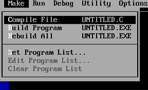 Le menu Make permet de compiler (Compile File) ou de compiler et lier (Build Program) des programmes. A partir de ce menu, vous pouvez également créer (Set Program List...) ou modifier (Edit Program List...) des listes de programmes nommant les composantes d'un programme multimodule.