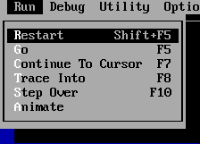 Une fois qu'un programme est compilé et réside en mémoire, utilisez le menu Run pour l'exécuter (Go). Vous pouvez l'exécuter du début (Restart) à la fin, exécuter de manière sélective des sections individuelles (Trace Into) ou parcourir le programme ligne par ligne (Animate).