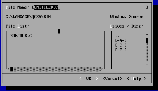 Tapez le nouveau nom du fichier source. Si vous n'ajoutez pas d'extension, le logiciel QuickC 2.51 ajoute automatiquement .C (BONJOUR devient BONJOUR.C, par exemple).