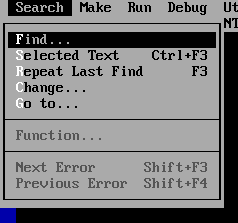 Le menu Search appelle les commandes recherchant (Find) ou remplacent du texte (Change...) ou des fonctions (Function...) dans les fichiers source. Il se déplace également vers une ligne spécifiée (Go to...) et recherche la ligne source suivante (Repeat Last Find) ayant provoqué une erreur de compilation (Next Error, Previous Error).