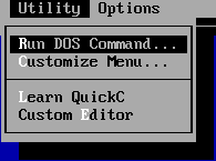 Le menu Utility vous permet d'exécuter des commandes et des programmes DOS (Run DOS Command...) à partir de l'environnement QuickC 2.51. Vous pouvez exécuter le didacticiel QuickC 2.51 en ligne (Learn QuickC) ou, si vous constatez que vous utilisez souvent certains programmes, vous pouvez les ajouter au menu Utility (Customize Menu...). Par exemple, vous pouvez ajouter votre éditeur de programme (Custom Editor) préféré à ce menu si vous le souhaitez.