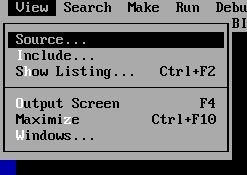 Le menu View contrôle l'écran visible. Vous pouvez basculer rapidement entre plusieurs modules (Source), lire les fichiers inclus (Include), rendre visible l'écran de sortie (Output Screen), agrandir la fenêtre source (Maximize) ou ouvrir et fermer les différentes fenêtres (Windows...).