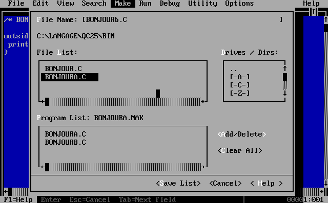 - Cliquez une fois sur BONJOURA.C et cliquez sur le bouton Add/Delete (ou double-cliquez simplement sur BONJOURA.C). Faites de même pour BONJOURB.C. Lorsque les deux programmes apparaissent dans la liste des programmes, cliquez sur le bouton de commande Save List pour enregistrer le fichier make.