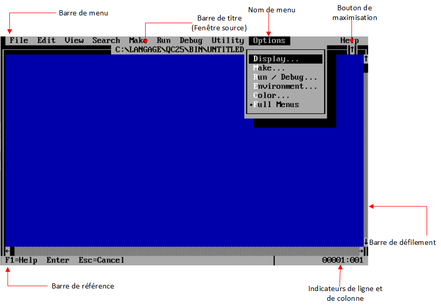 L'image suivante montre un écran QuickC 2.51 typique, avec des étiquettes décrivant ses parties. Certaines parties ne fournissent que des informations :