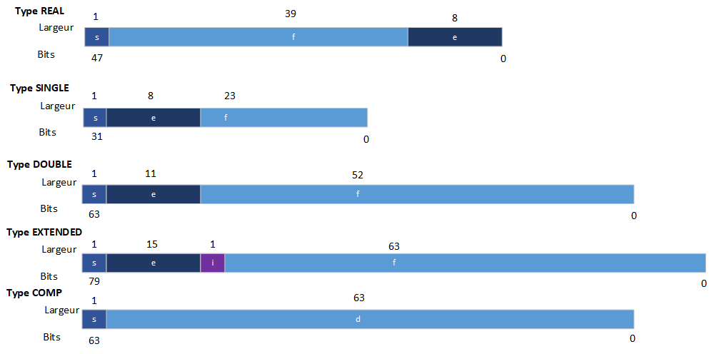 La figure suivante affiche les formats utilisés pour représenter les nombres à virgule flottante de différents niveaux de précision. Le QuickPascal utilise ces formats de données qu'un coprocesseur mathématique soit installé ou non. Si un coprocesseur n'est pas installé, alors QuickPascal fournit des procédures pour exécuter des calculs en virgule flottante. En cas d'arrondi, il n'est pas garanti que ces procédures produiront précisément les mêmes résultats qu'un coprocesseur.