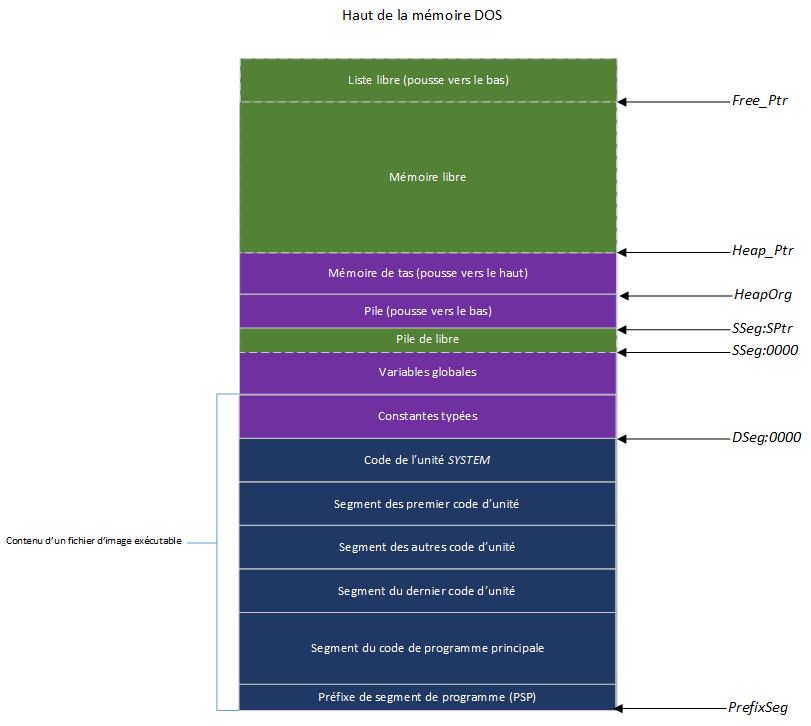 Le tas se compose du reste de la RAM disponible, sauf si vous utilisez la directive du compilateur {$M} pour définir la taille maximale du tas. Le tas contient toutes les variables dynamiques allouées via des appels à New ou GetMem. Si vous savez à l'avance que votre programme doit disposer d'une certaine quantité d'espace de mémoire de tas pour s'exécuter correctement, vous pouvez utiliser la directive de compilateur {$M} pour spécifier une taille de tas minimale. Le DOS ne chargera pas le programme à moins qu'il ne puisse allouer suffisamment de mémoire pour la taille de tas minimale demandée.