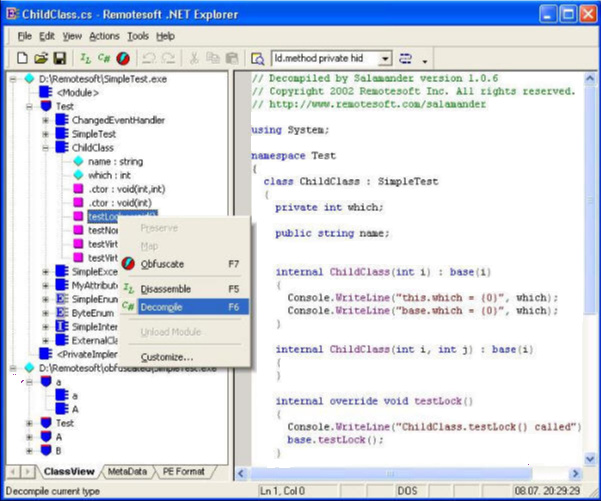 Le Salamander .NET Decompiler est un décompilateur .NET convertissant les fichiers exécutables (.EXE ou .DLL) du format binaire Intermediate Language (IL, MSIL, CIL) en codes sources de haut niveau, tels que C#, C managé, VB.NET,...